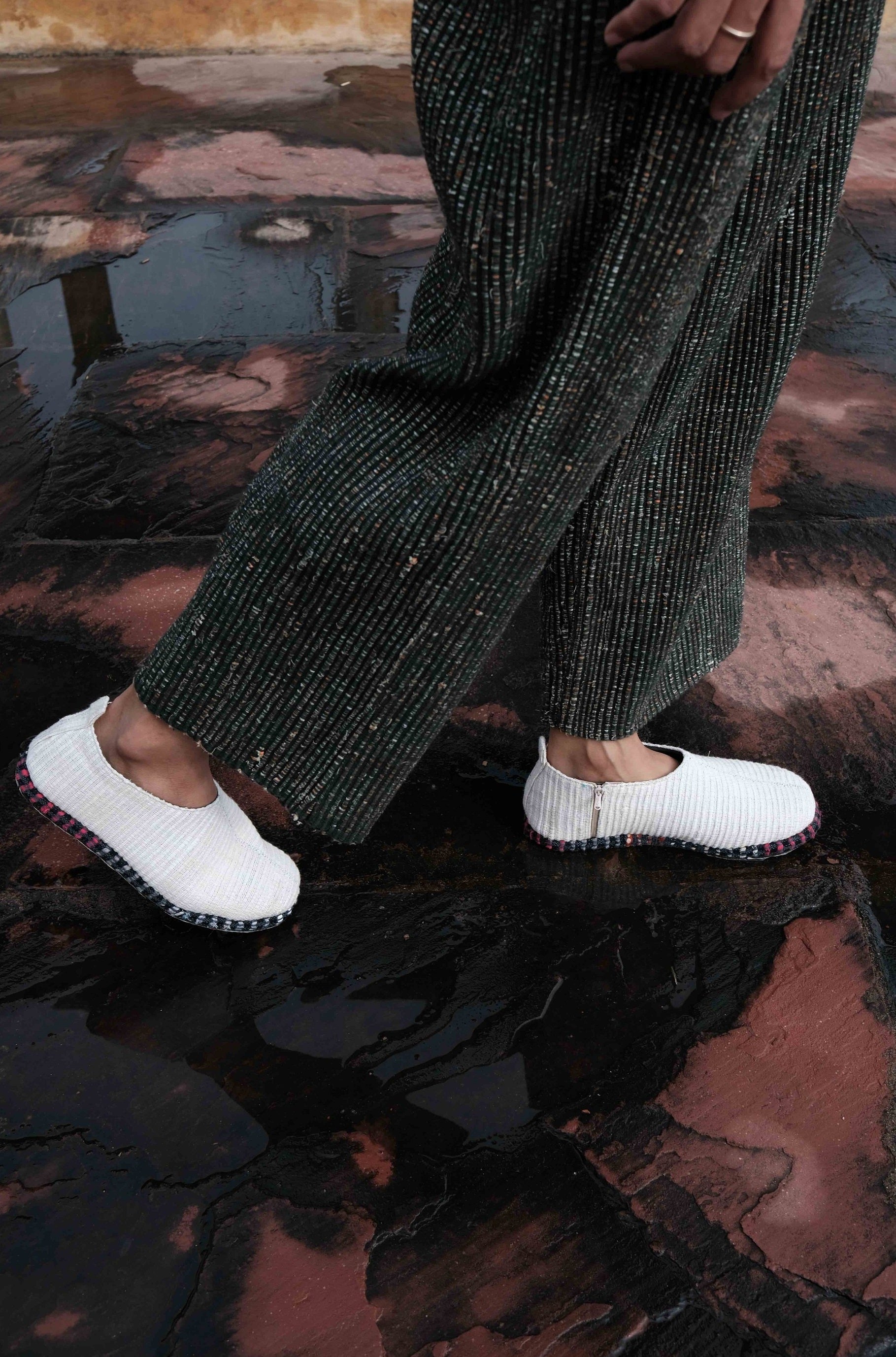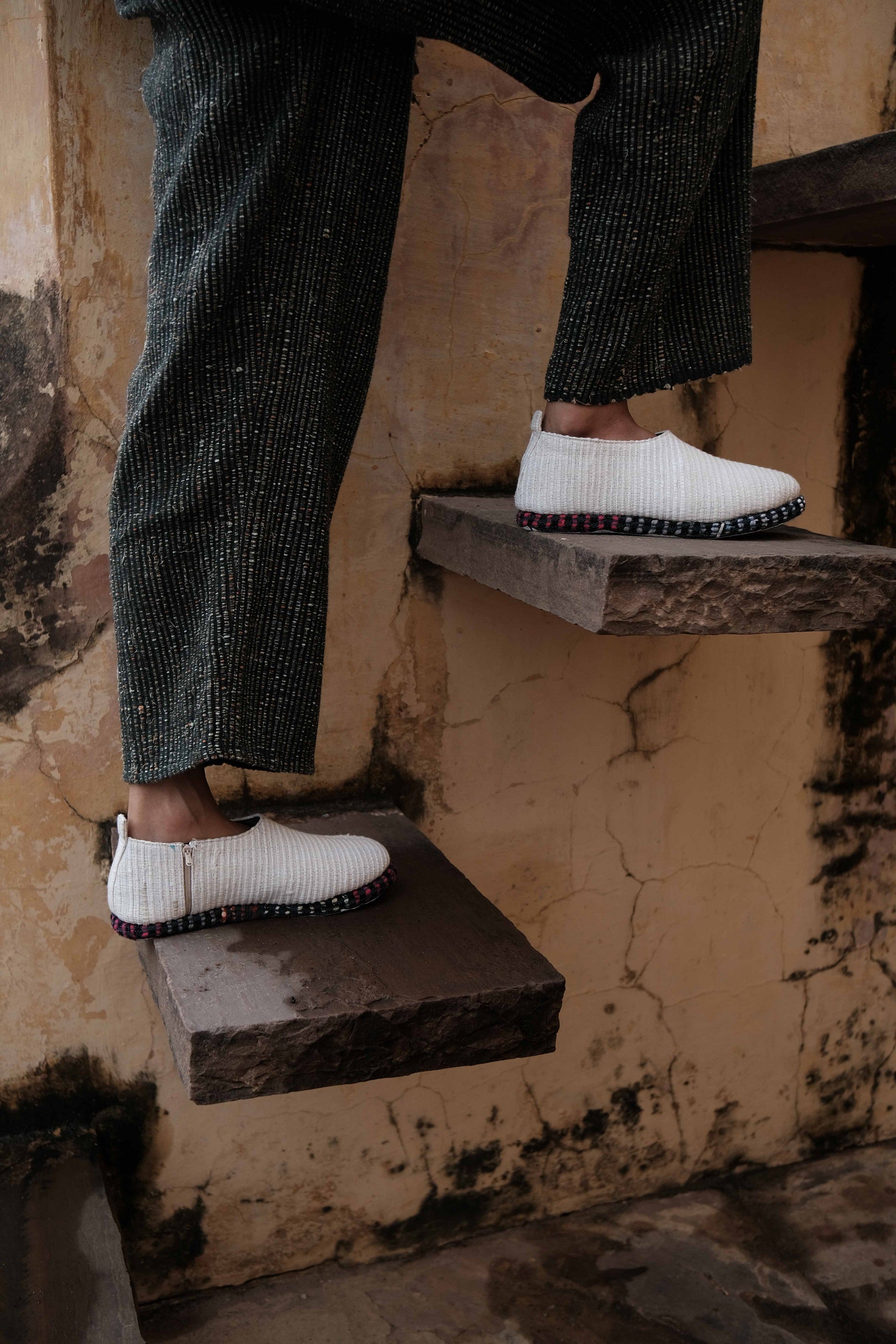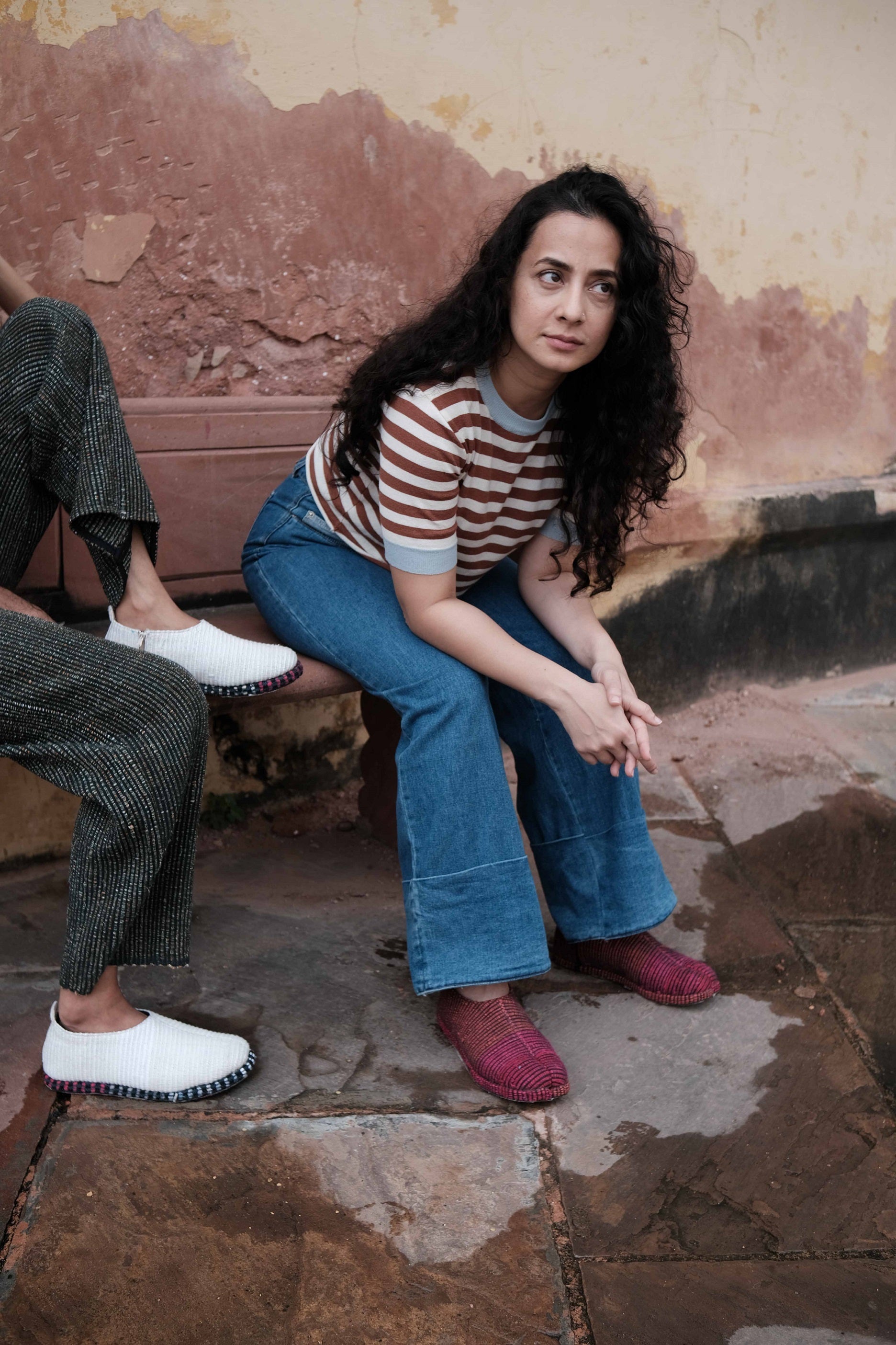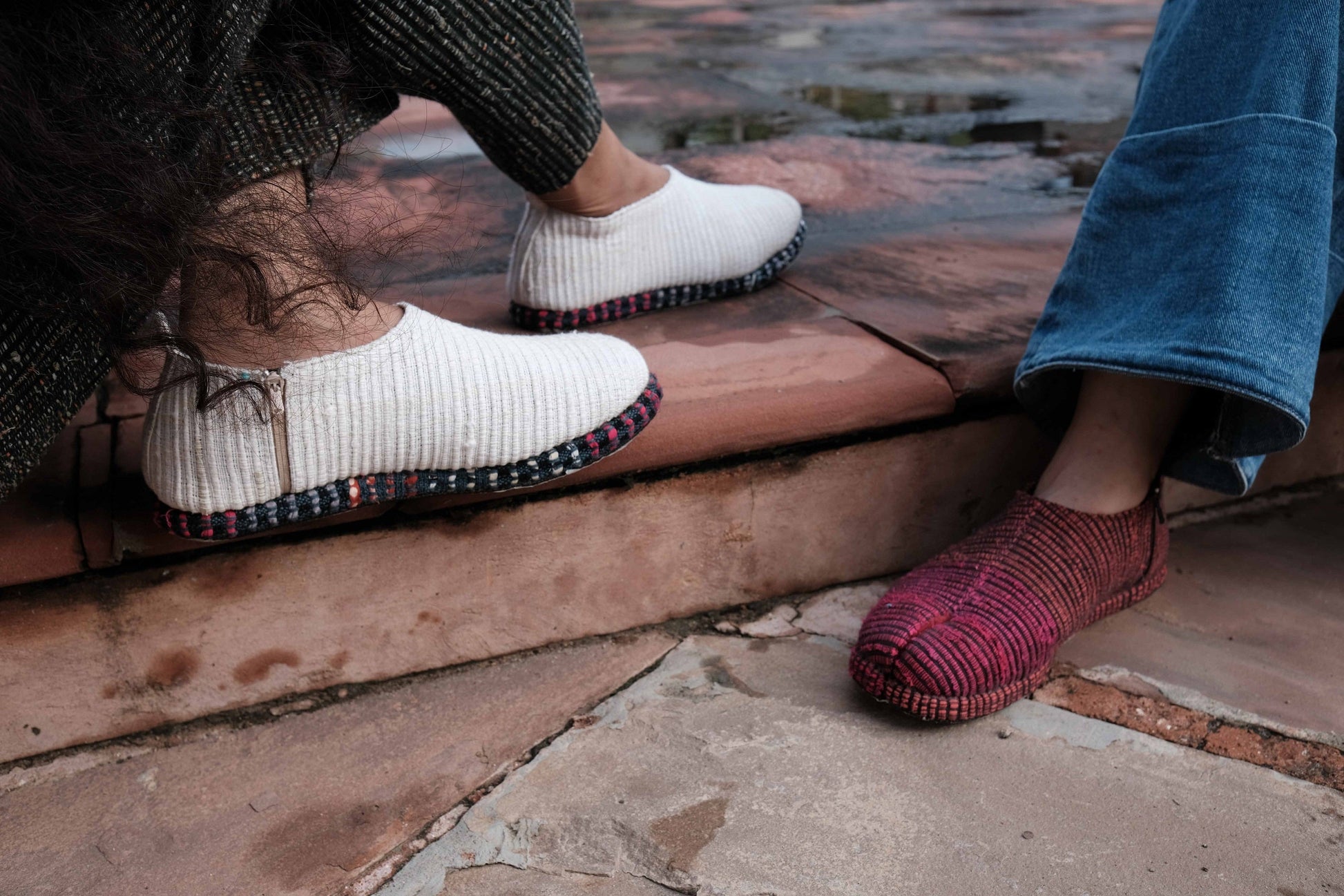 A sock shoe as they are in form with a bit more structure. Made with upcycled Iro Iro fabric and tyre waste for soles which are much more durable with a grip than your regular shoes